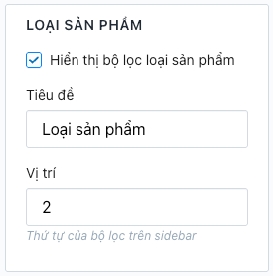 Truy cập Admin > Tùy chỉnh giao diện > Bộ lọc sản phẩm > Loại sản phẩm