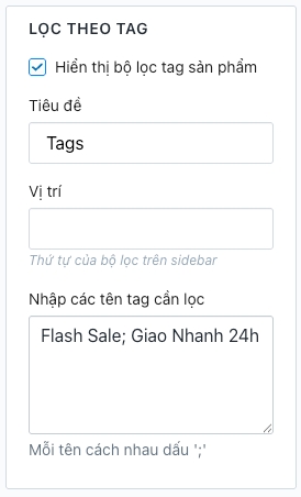 Truy cập Admin > Tùy chỉnh giao diện > Bộ lọc sản phẩm > Lọc theo tag