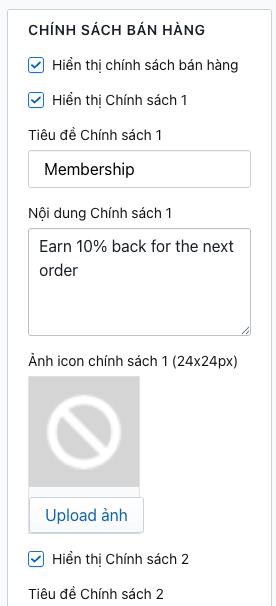 Truy cập Admin > Tùy chỉnh giao diện > Trang giỏ hàng > Chính sách bán hàng