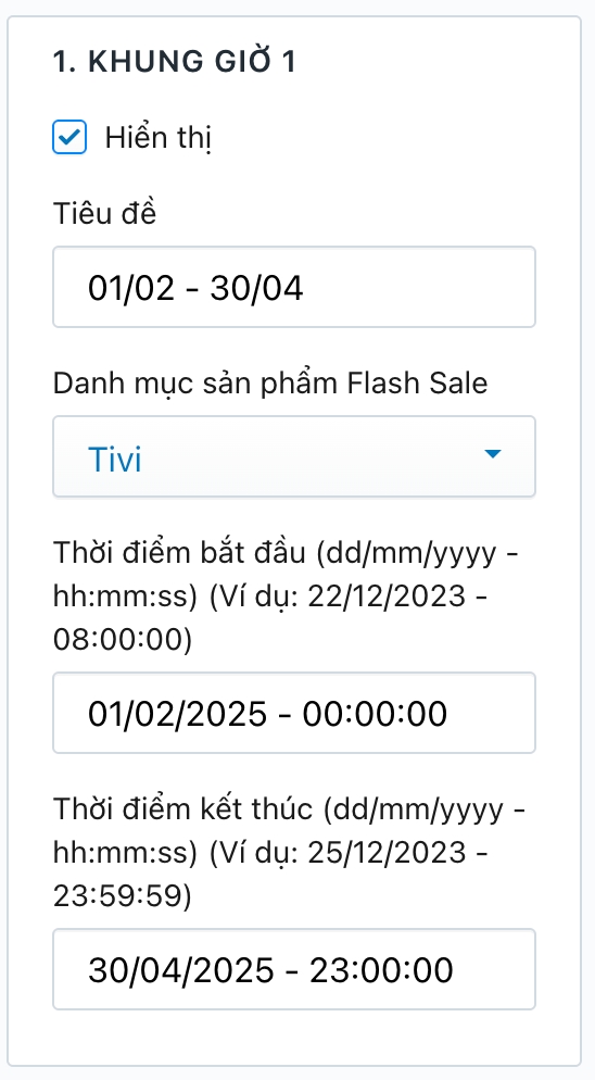 Giao diện hỗ trợ thiết lập Flash Sale theo 3 khung giờ