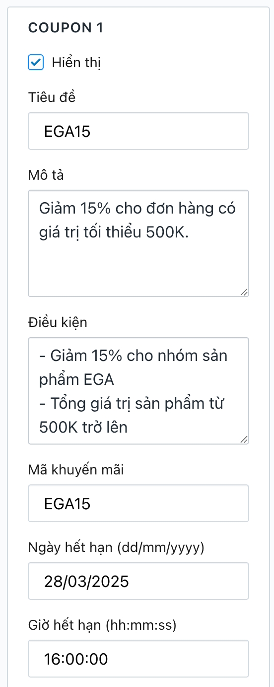 Truy cập Admin > Tùy chỉnh giao diện > Nhóm mã khuyến mãi - Trang chủ > Coupon 1,2,..,8