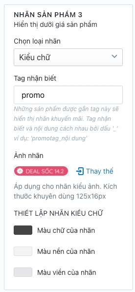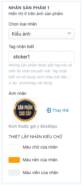 Truy cập Admin > Tùy chỉnh giao diện > Khung và Nhãn sản phẩm > Nhãn sản phẩm