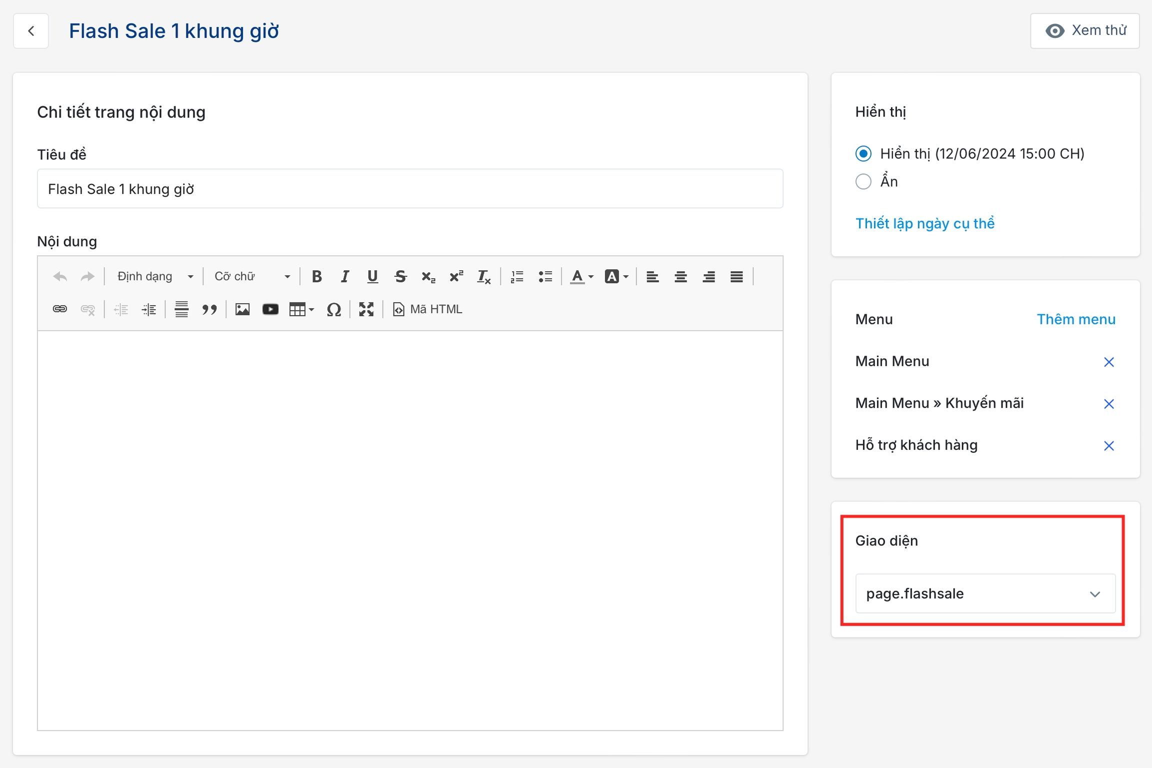 Đặt Tiêu đề cho trang nội dung và chọn Khung giao diện là page.flashsale