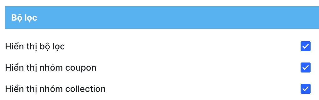 Truy cập Admin > Tùy chỉnh giao diện > Trang danh sách sản phẩm > Bộ lọc