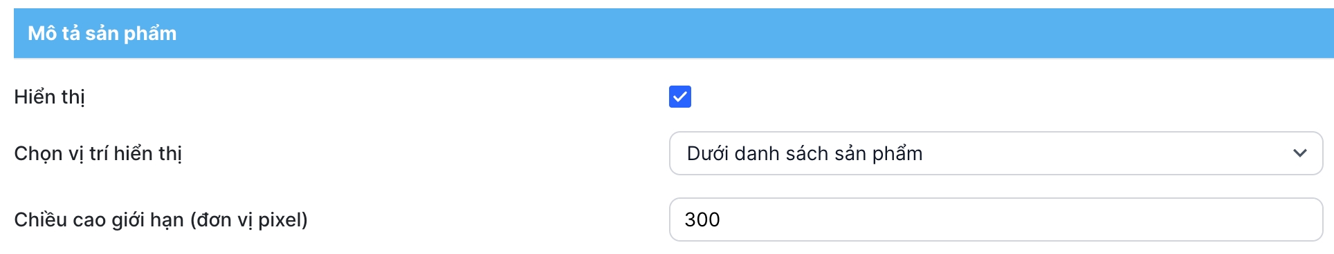 Truy cập Admin > Tùy chỉnh giao diện > Trang danh sách sản phẩm > Mô tả sản phẩm