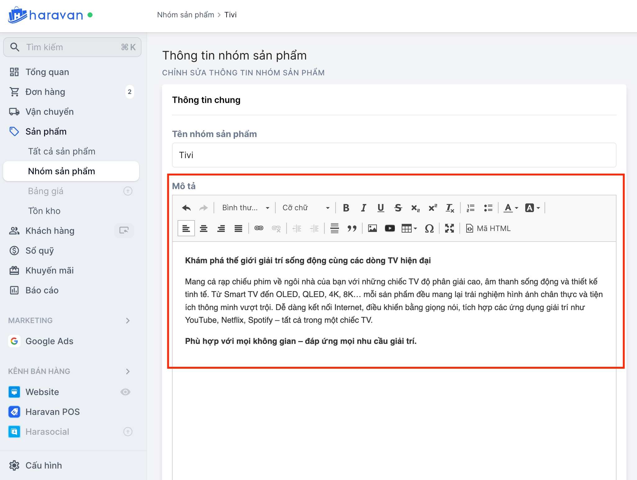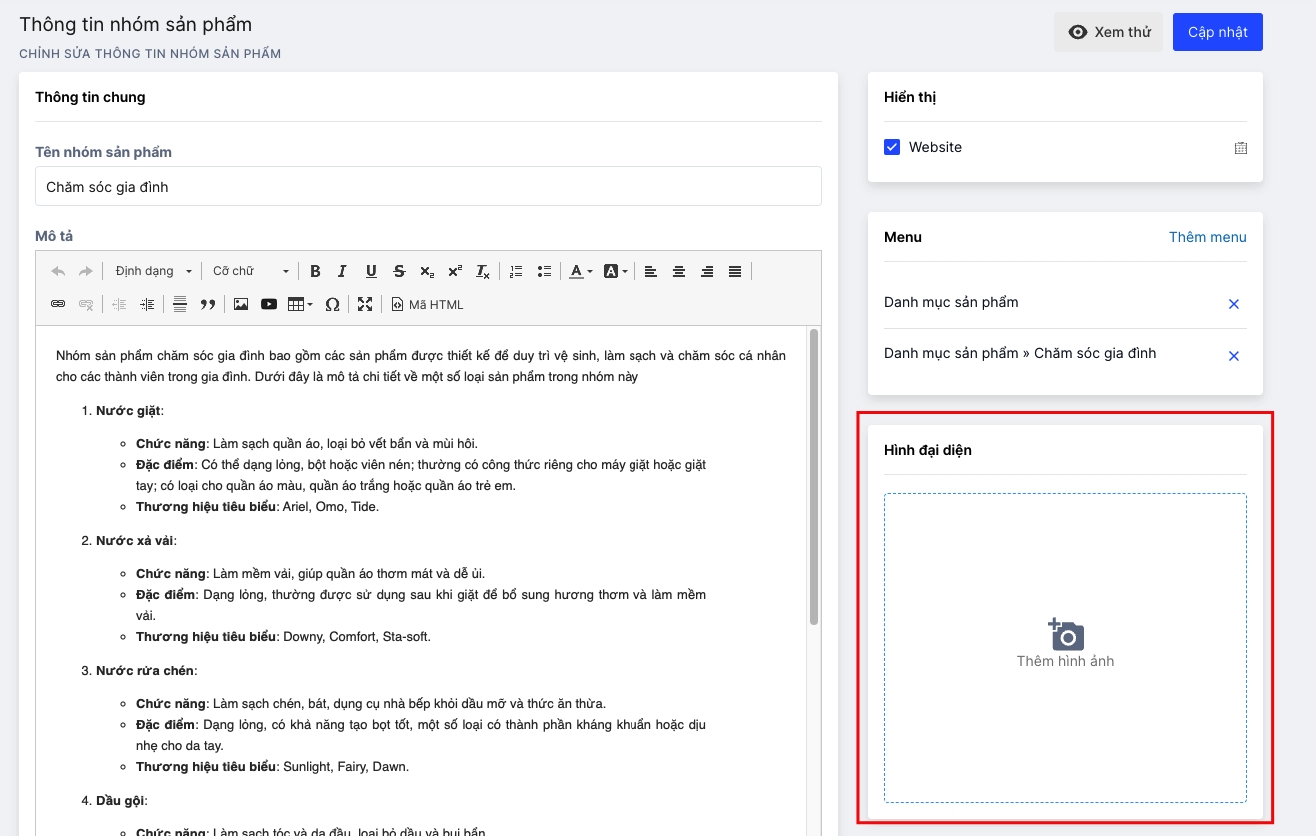 Admin>Nhóm sản phẩm> Vào nhóm sản phẩm cần thêm mô tả > Nhập nội dung mô tả