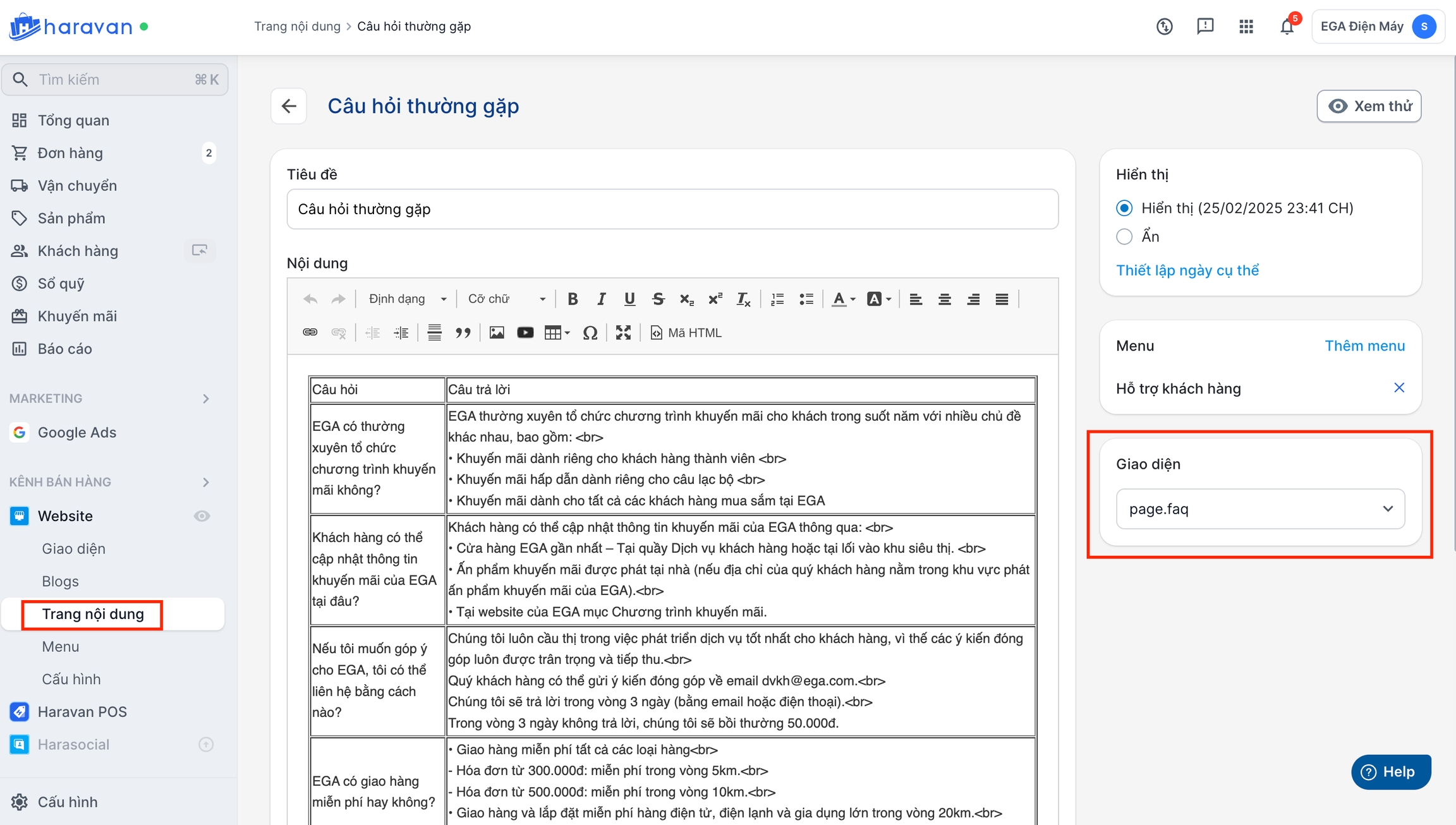 Sau khi thực hiện theo hướng dẫn trên, bạn đã có thể thiết lập Trang FAQ cho giao diện trên Haravan. Trong quá trình thiết lập, nếu có thắc mắc vui lòng liên hệ support@egany.com.