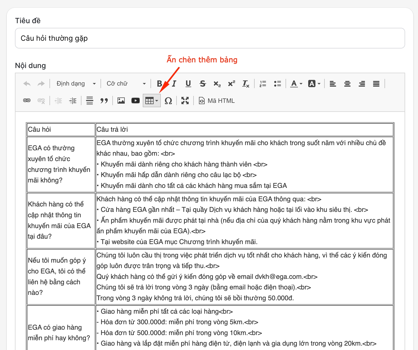 Bước 2: Nhập liệu vào phần nội dung theo bảng 2 cột: Câu hỏi và Câu trả lời như sau:
