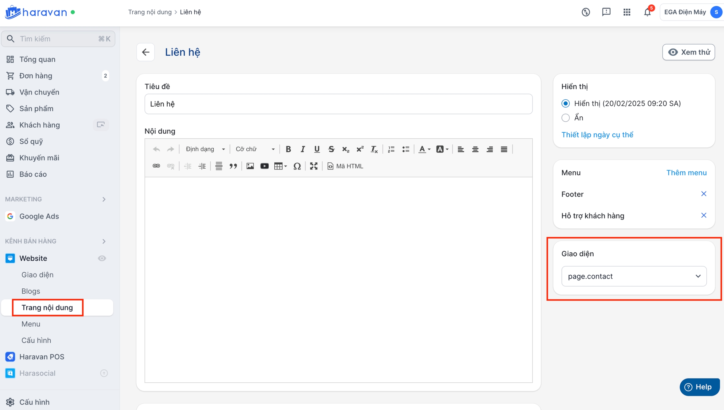 Sau khi thiết lập, bạn cần tạo trang Liên hệ sử dụng khung giao diện page.contact