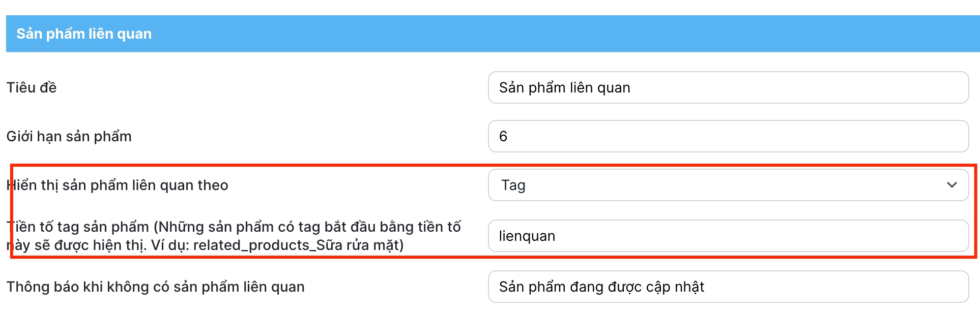 Hiển thị những sản phẩm được nhập tag (nhãn) giống nhau và có chung 1 tiền tố được quy định trong thiết lập