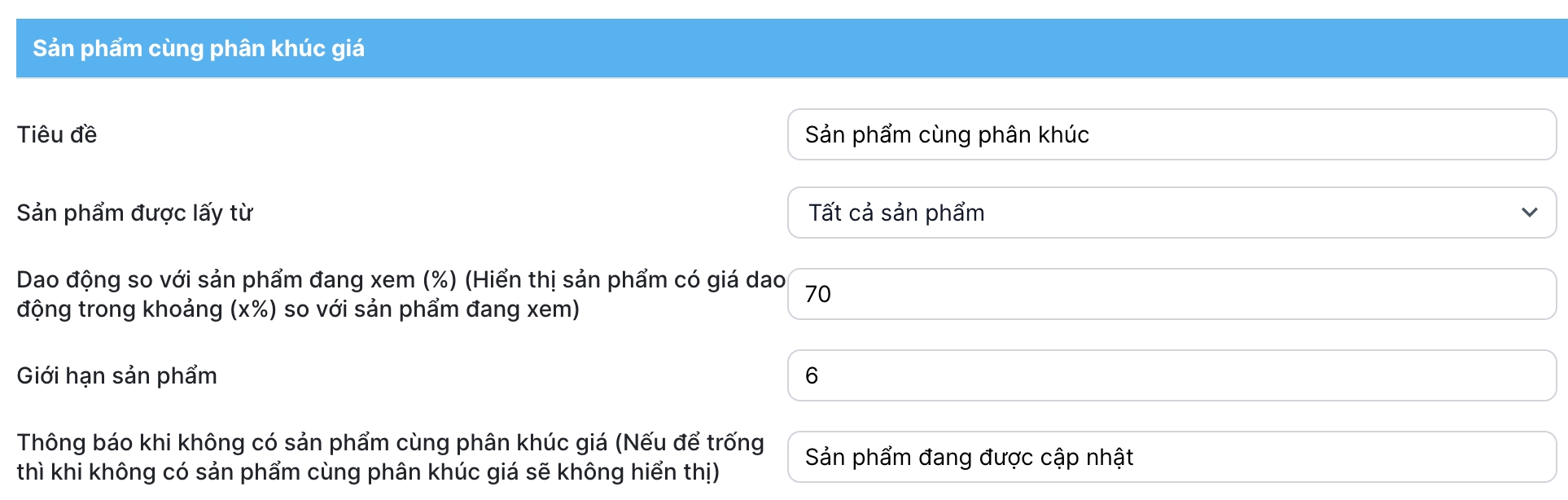 Truy cập Admin > Tùy chỉnh giao diện > Trang sản phẩm > Sản phẩm cùng phân khúc giá