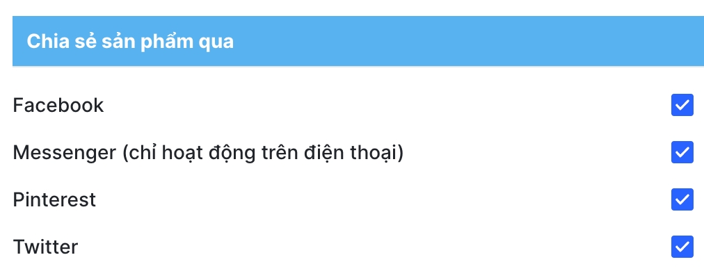 Truy cập Admin > Tùy chỉnh giao diện > Trang sản phẩm > Chia sẻ sản phẩm qua
