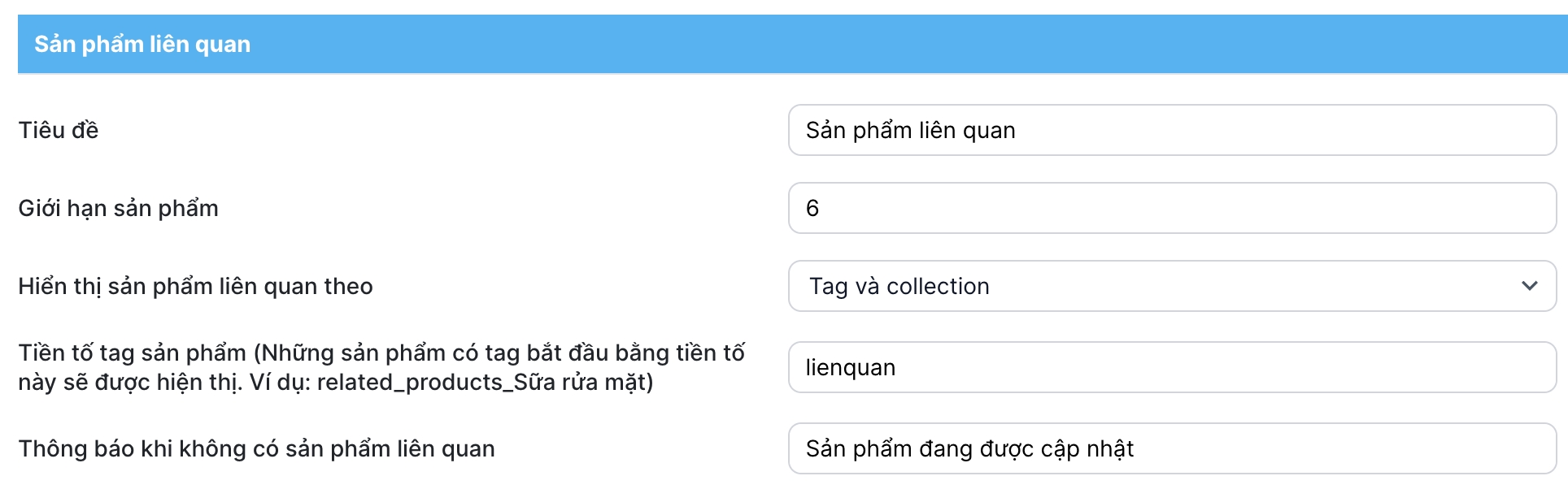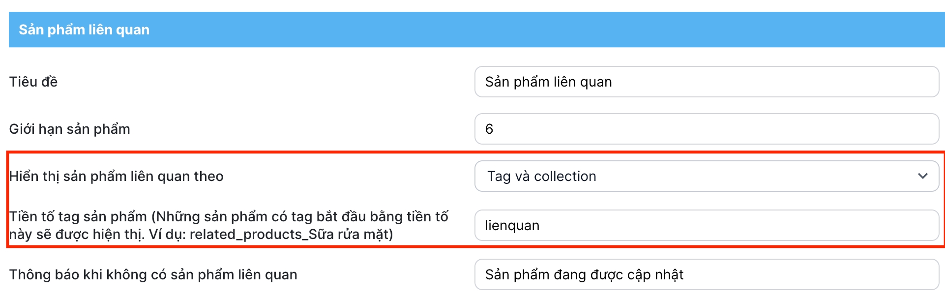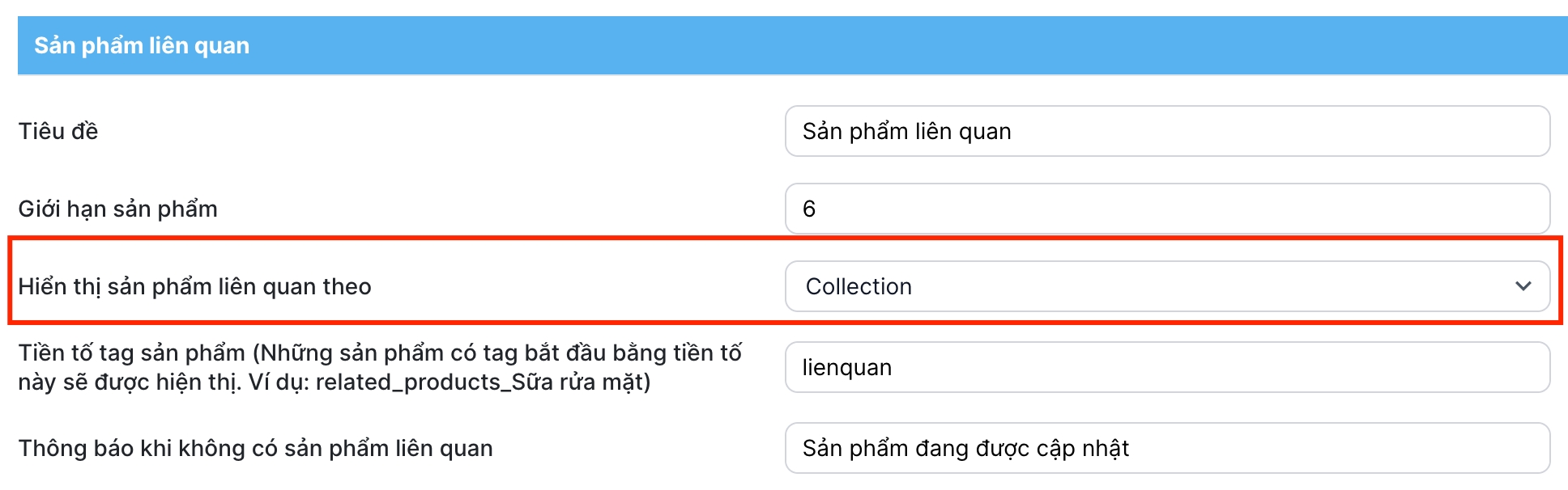 Nếu sản phẩm có nhập tag sản phẩm liên quan thì hiển thị theo tag. Nếu không có tag liên quan thì hiển thị theo collection