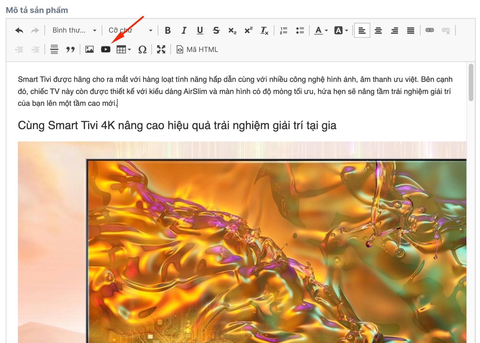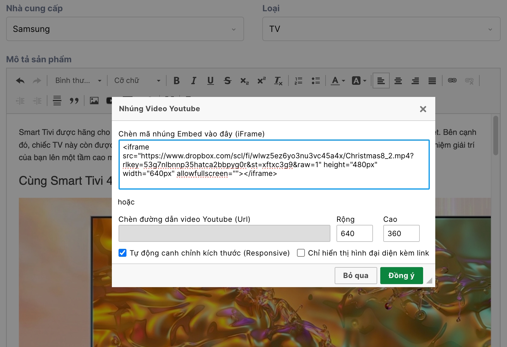 <iframe src="https://www.dropbox.com/scl/fi/wlwz5ez6yo3nu3vc45a4x/Christmas8_2.mp4?rlkey=53g7nlbnnp35hatca2bbpyg0r&st=xftxc3g9&raw=1" height="480px" width="640px" allowfullscreen=""></iframe>Bước 4: Chèn iframe vào sản phẩm (Ấn chèn video, dán iframe vào)