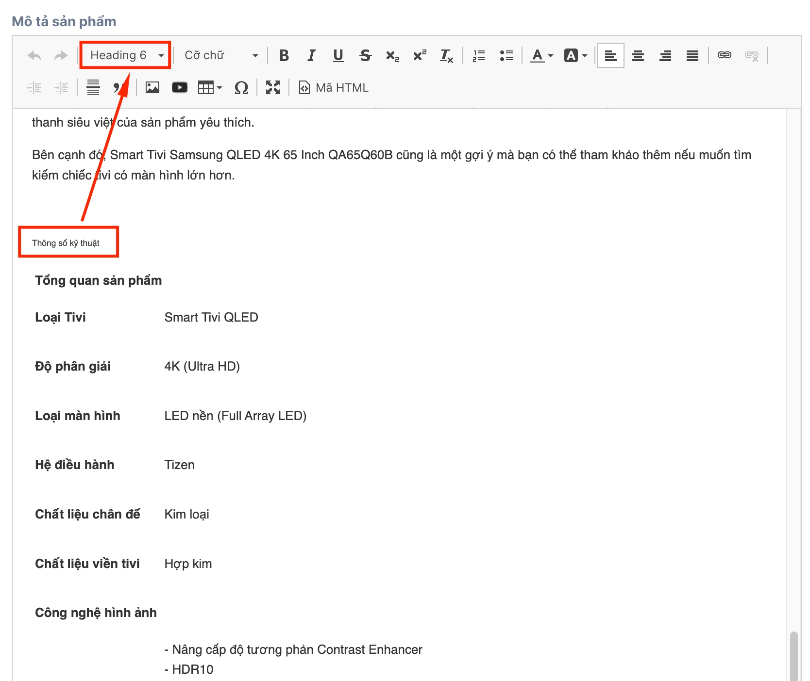 Truy cập vào sản phẩm cần nhập liệu thông số kỹ thuật, đến cuối phần nội dung mô tả
