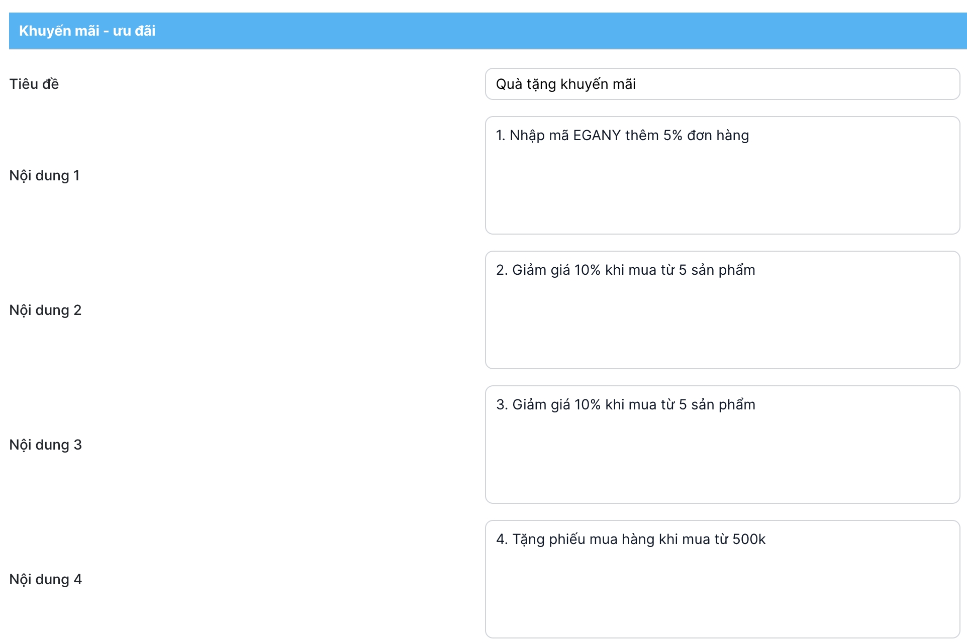 Bước 2: Nhập liệu nội dung cho mục Khuyến mãi - Ưu đãi