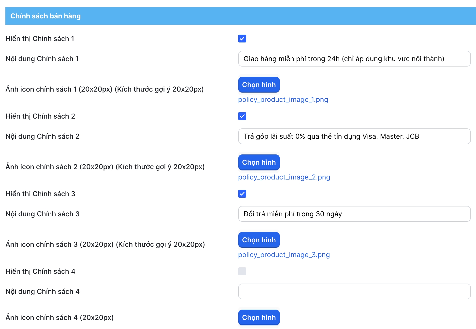 Truy cập Admin > Tùy chỉnh giao diện > Trang sản phẩm > Chính sách bán hàng