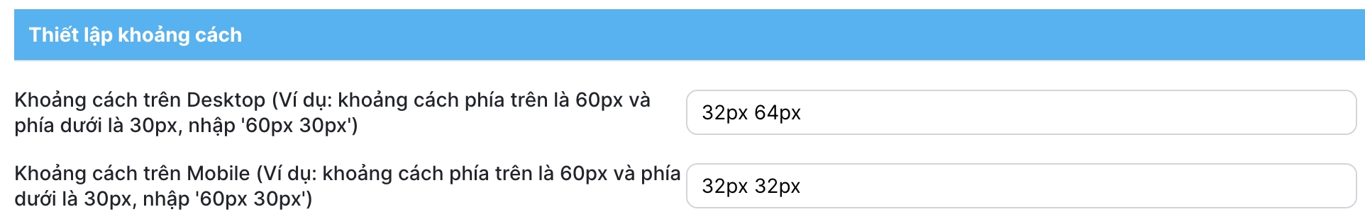 Truy cập Admin > Tùy chỉnh giao diện > Sản phẩm nổi bật - Trang chủ > Thiết lập khoảng cách