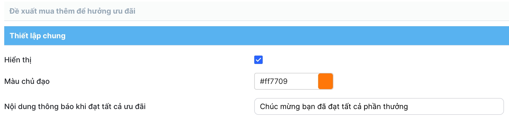 Truy cập Admin > Tùy chỉnh giao diện > Đề xuất mua thêm để hưởng ưu đãi > Thiết lập chung