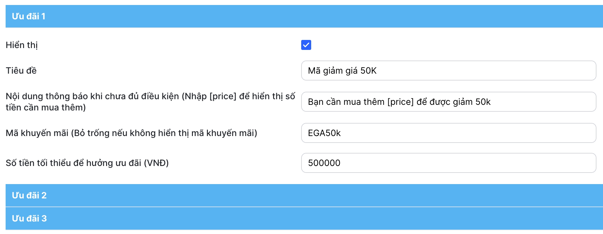 Giao diện hỗ trợ tối đa 3 mốc ưu đãi.