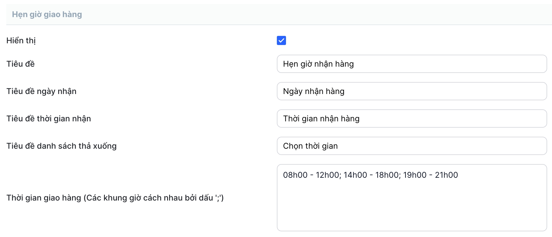 Tính năng này cho phép khách hàng chọn ngày giờ giao hàng (theo khung giờ bạn tự định nghĩa. Ví dụ: Sáng: 08h00 - 12h00; Chiều: 14h00 - 18h00; Tối: 19h00 - 21h00) để khách hàng có thể ước tính hàng của mình được giao trong khoảng thời gian nào.