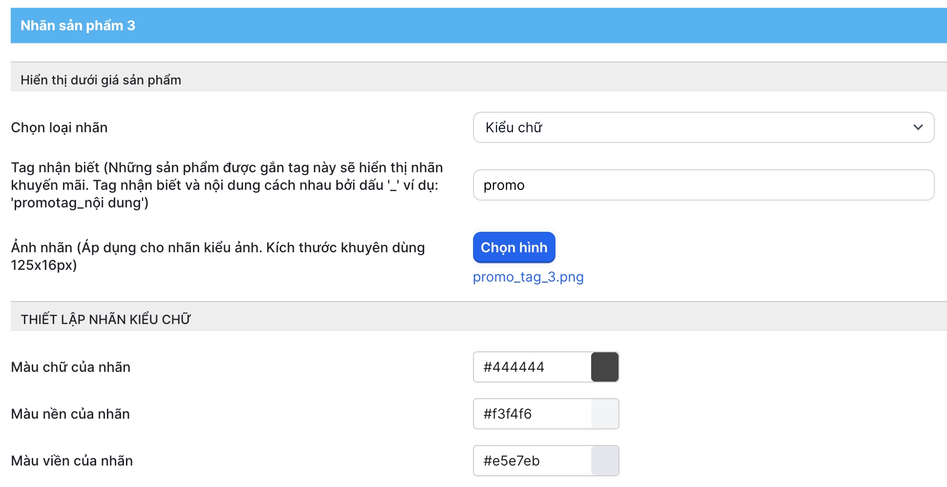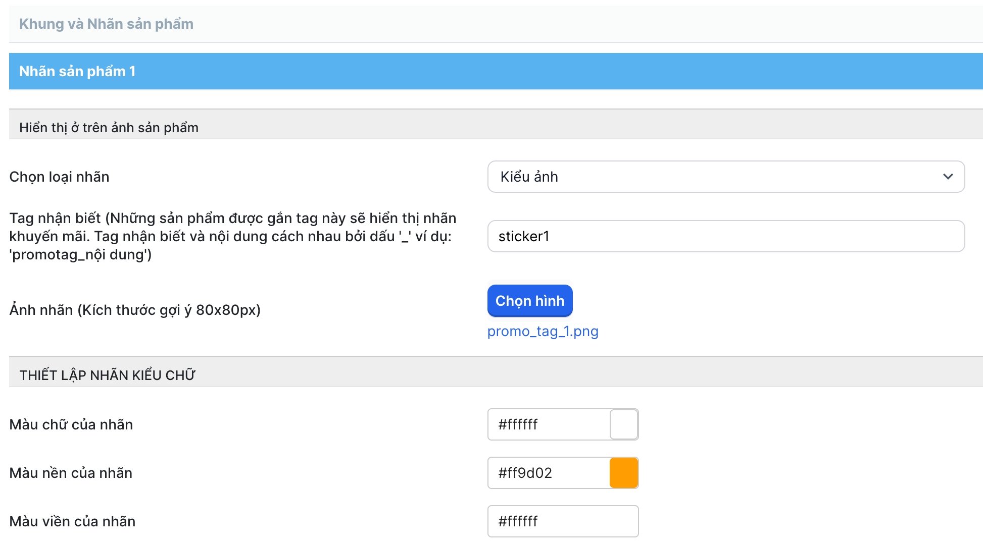Truy cập Admin > Tùy chỉnh giao diện > Khung và Nhãn sản phẩm > Nhãn sản phẩm