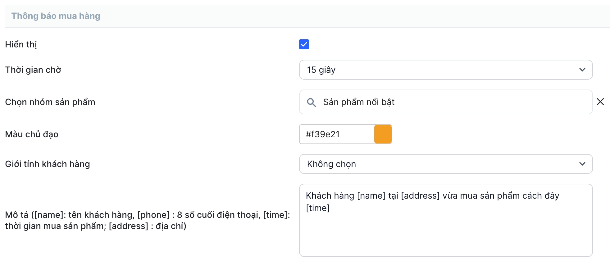 Truy cập Admin > Tùy chỉnh giao diện > Thông báo mua hàng