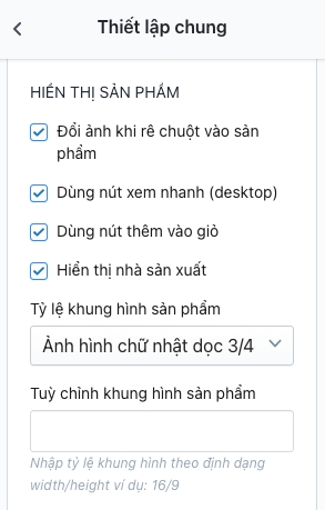 Truy cập Thiết lập chung > THIẾT LẬP CHUNG SẢN PHẨM > HIỂN THỊ SẢN PHẨM