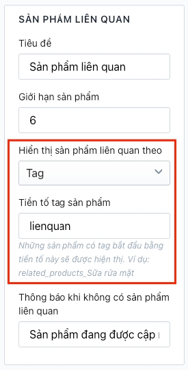 Hiển thị những sản phẩm được nhập tag (nhãn) giống nhau và có chung 1 tiền tố được quy định trong thiết lập