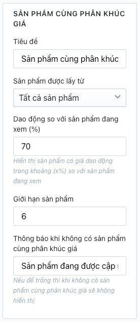 Truy cập Admin > Tùy chỉnh giao diện > Trang sản phẩm > Sản phẩm cùng phân khúc giá