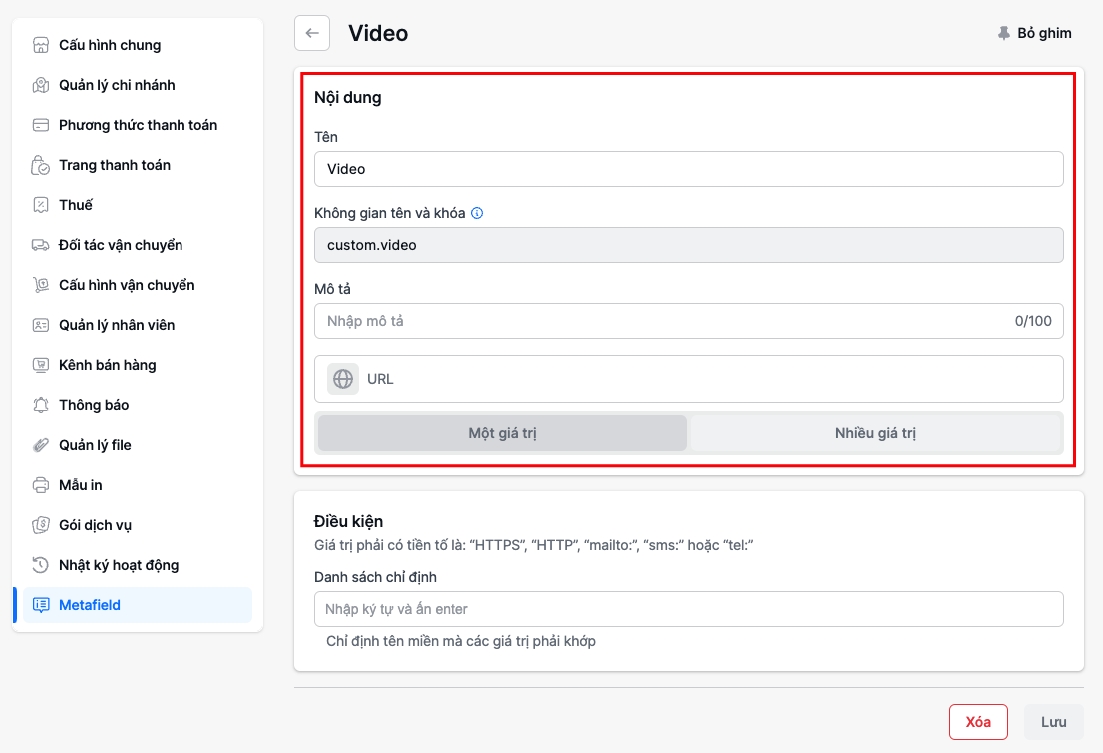 Điền thông tin định nghĩa cho metafield (nhập liệu giống như hình bên dưới) → Ấn Lưu