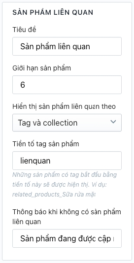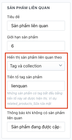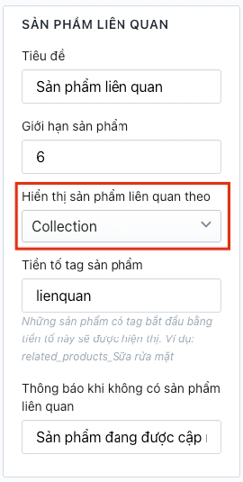 Nếu sản phẩm có nhập tag sản phẩm liên quan thì hiển thị theo tag. Nếu không có tag liên quan thì hiển thị theo collection