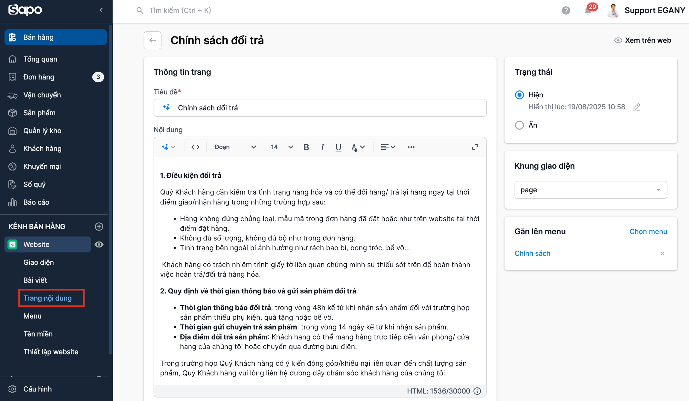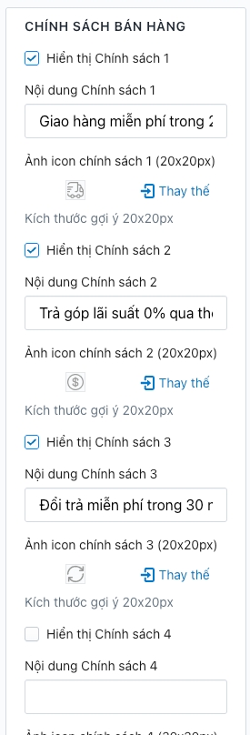 Truy cập Admin > Tùy chỉnh giao diện > Trang sản phẩm > Chính sách bán hàng