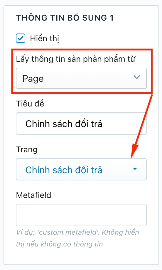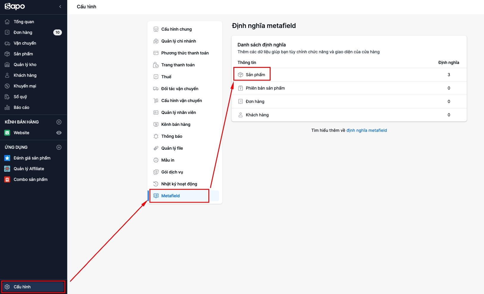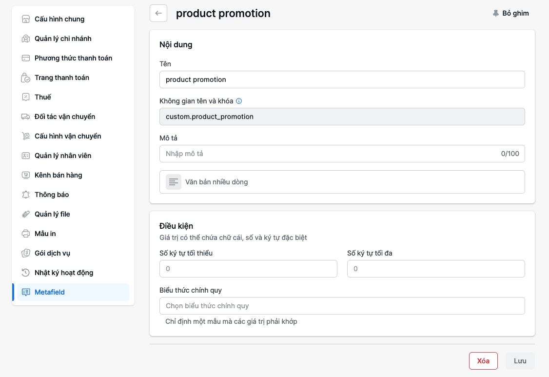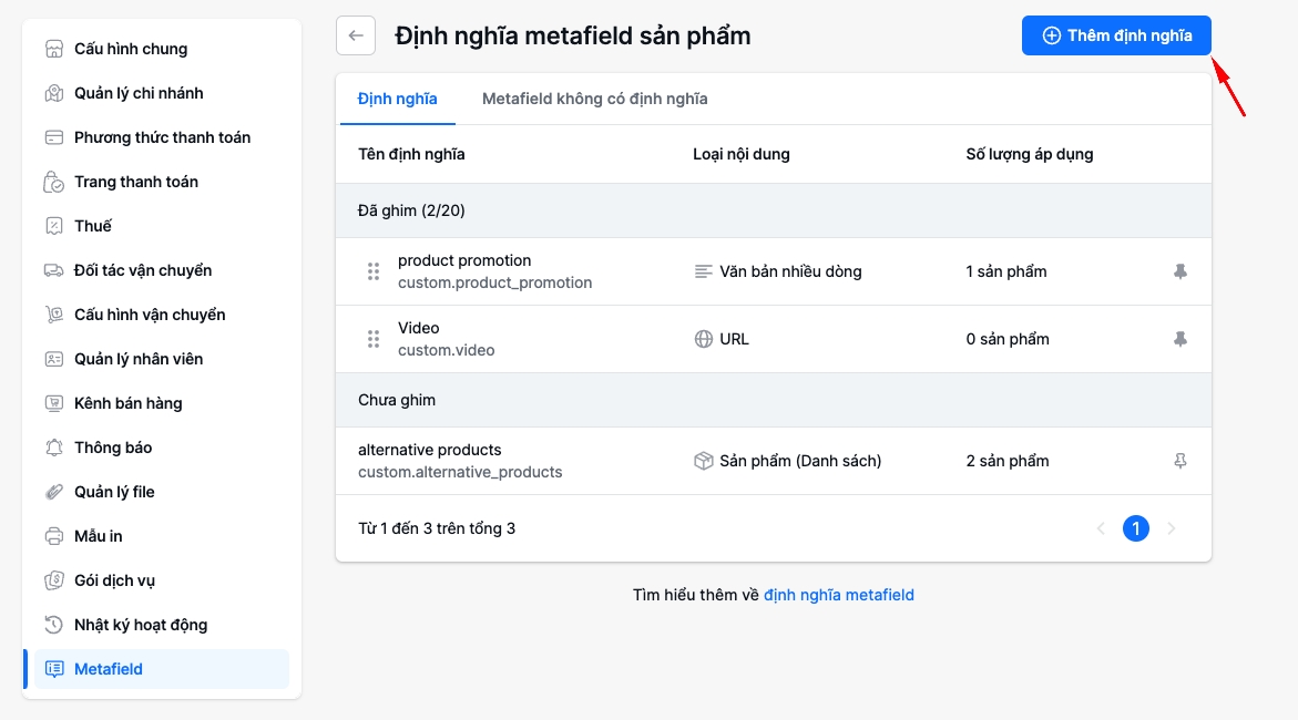 Cấu hình>Metafield>Sản phẩm