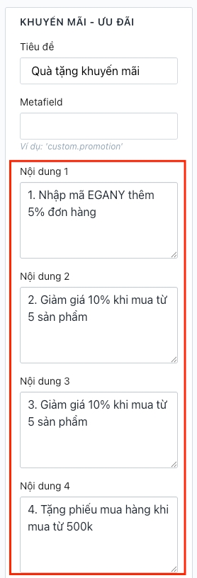 Tùy chỉnh giao diện>Trang sản phẩm>Khuyến mãi - ưu đãiNhập Không gian tên và khóa (ở bước trên) vào ô Metafield