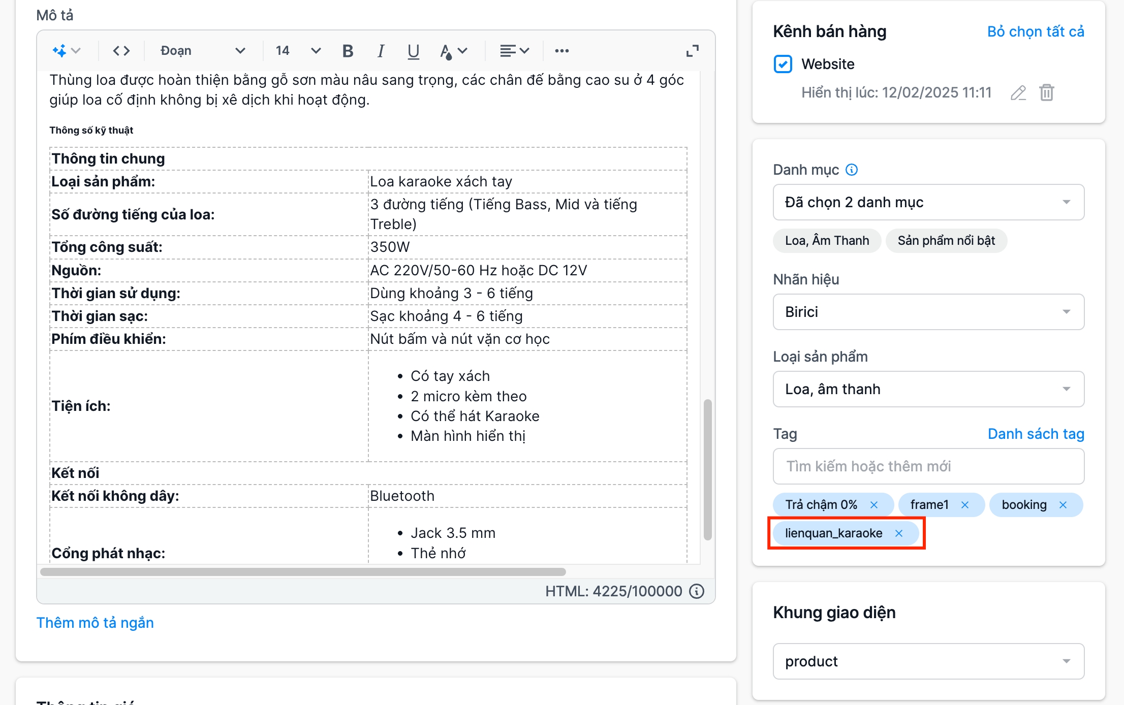Hướng dẫn nhập liệu nội dung trang kích thước sản phẩm