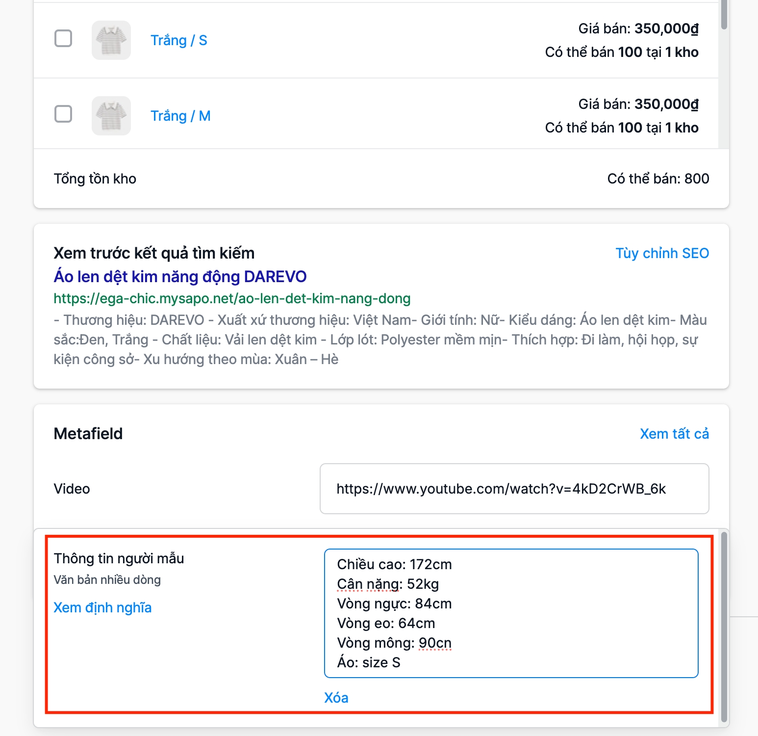 Bước 2: Nhập liệu link video Youtube vào Metafield của từng sản phẩm