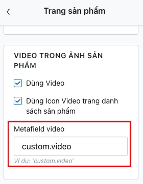 Tùy chỉnh giao diện>Trang sản phẩm>Video trong ảnh sản phẩmNhập Không gian tên và khóa (ở bước trên) vào ô Metafield video