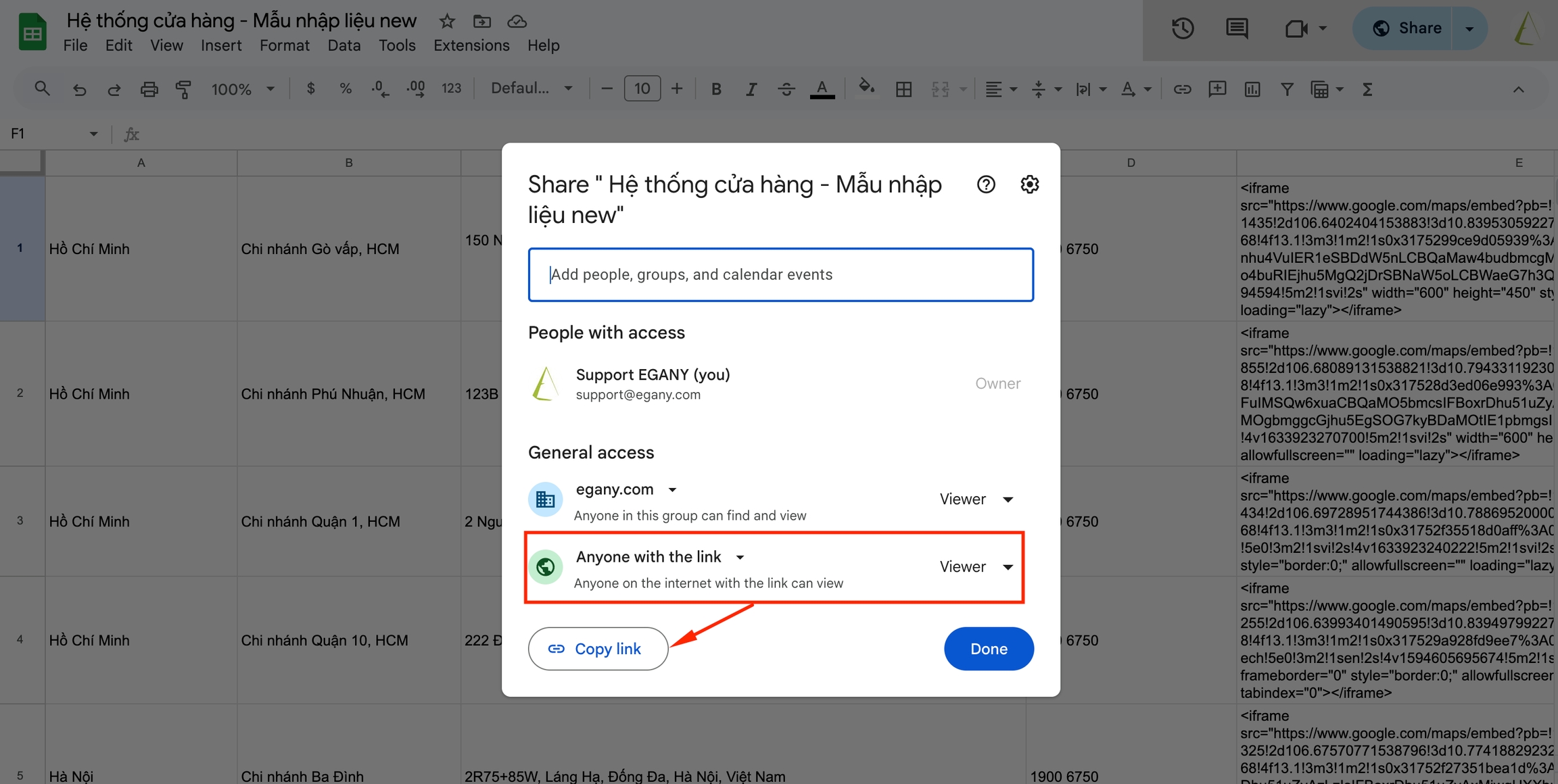 Bước 4: Thiết lập chia sẻ file ở chế độ Công khai (Chia sẻ với bất kỳ ai có liên kết) → Copy Link