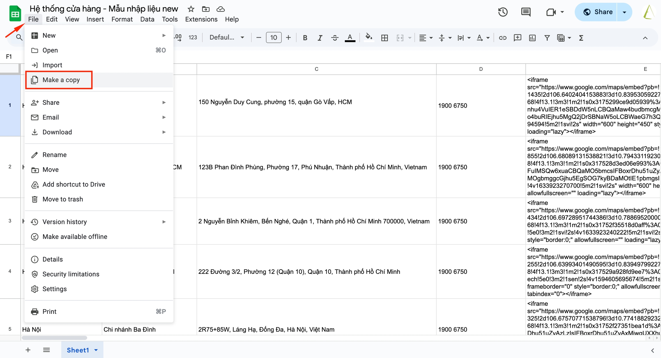 Bước 2: Tạo bản sao của file Google Sheet vừa mở